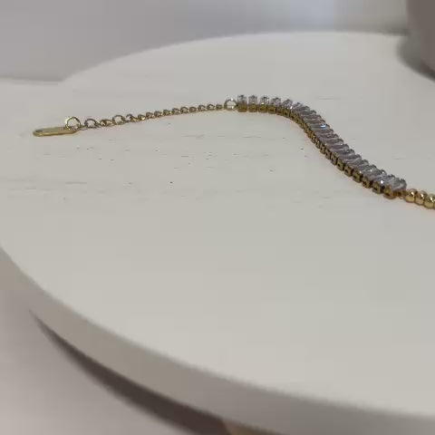 Shimmer meets sophistication in the Crystal Baguette Bracelet, a timeless piece designed to elevate your every look. Featuring a row of meticulously cut baguette crystals set on a sleek gold chain, this bracelet blends minimalism with luxury—perfect for both day elegance and night glamour.
